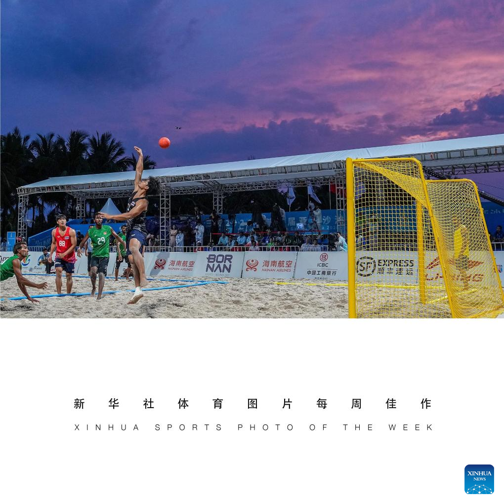 Players of both sides compete during the beach handball men's preliminary round group B match between Thailand and Maldives at the 6th Asian Beach Games in Sanya, south China's Hainan Province, April 24, 2026. (Xinhua/Li Bo)