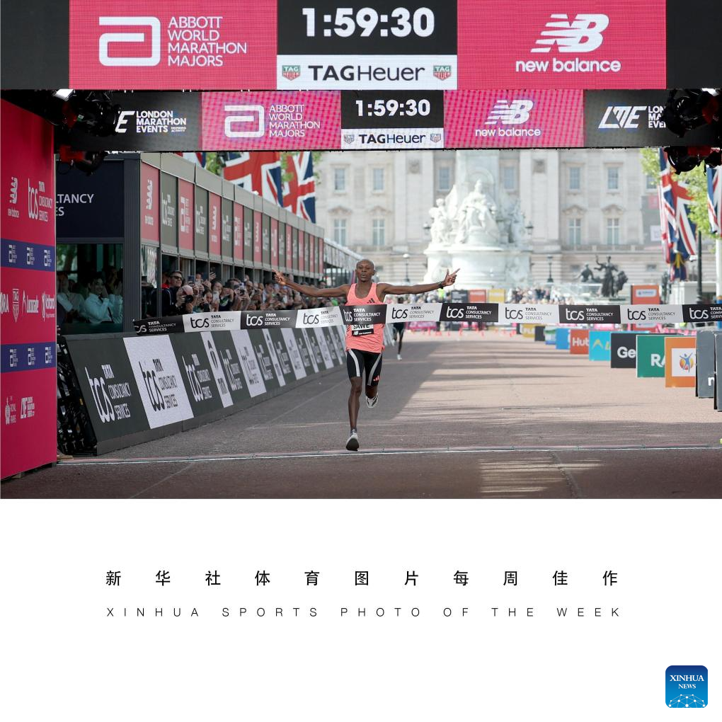 Sebastian Sawe of Kenya crosses the finish line during the men's elite race at the London Marathon in London, Britain, April 26, 2026. (Xinhua/Li Ying)