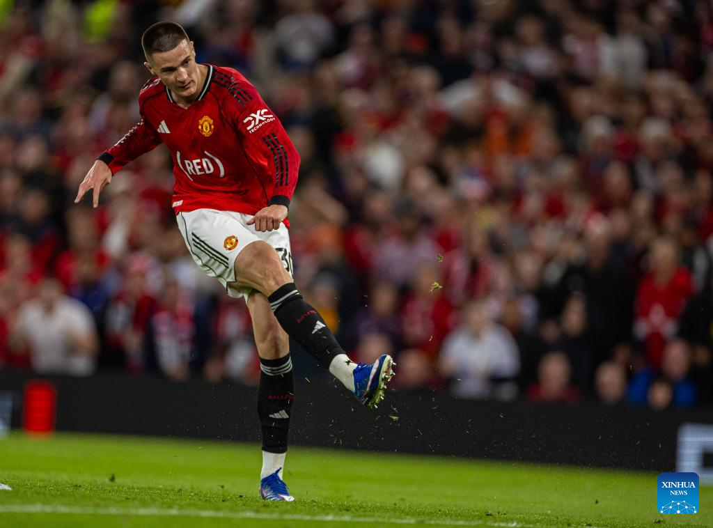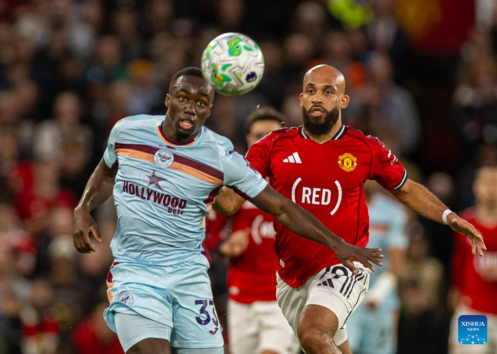 Brentford's Mathias Jensen (L) scores during the English Premier League match between Manchester United FC and Brentford FC in Manchester, Britain, April 27, 2026. (Xinhua)