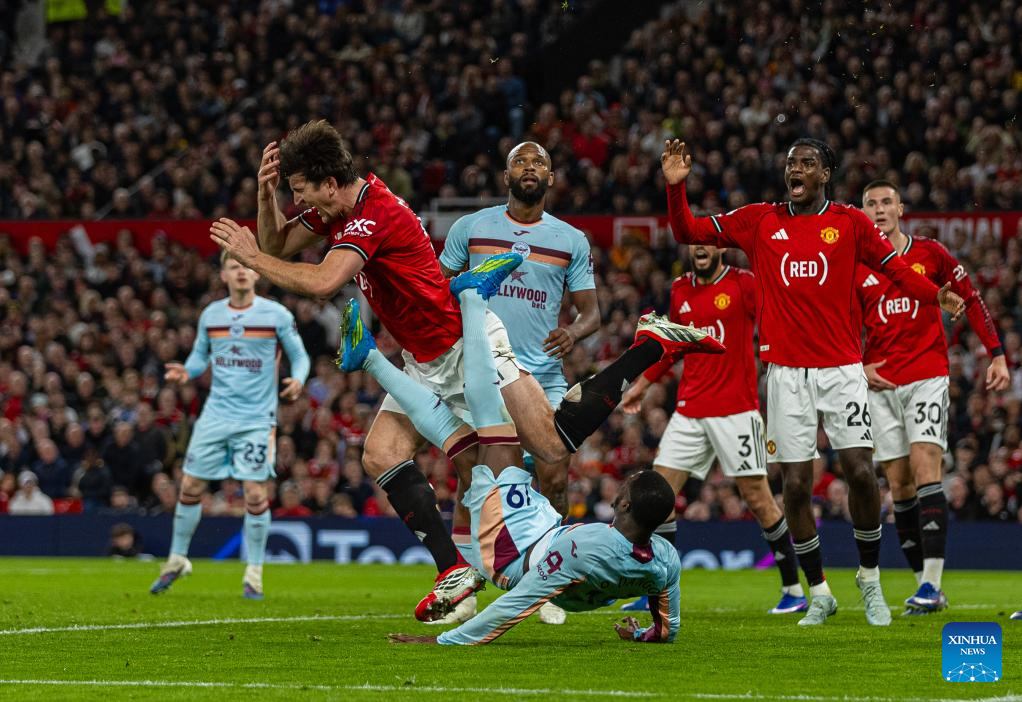 Brentford's Dango Ouattara (bottom) competes with Manchester United's Harry Maguire during the English Premier League match between Manchester United FC and Brentford FC in Manchester, Britain, April 27, 2026. (Xinhua)