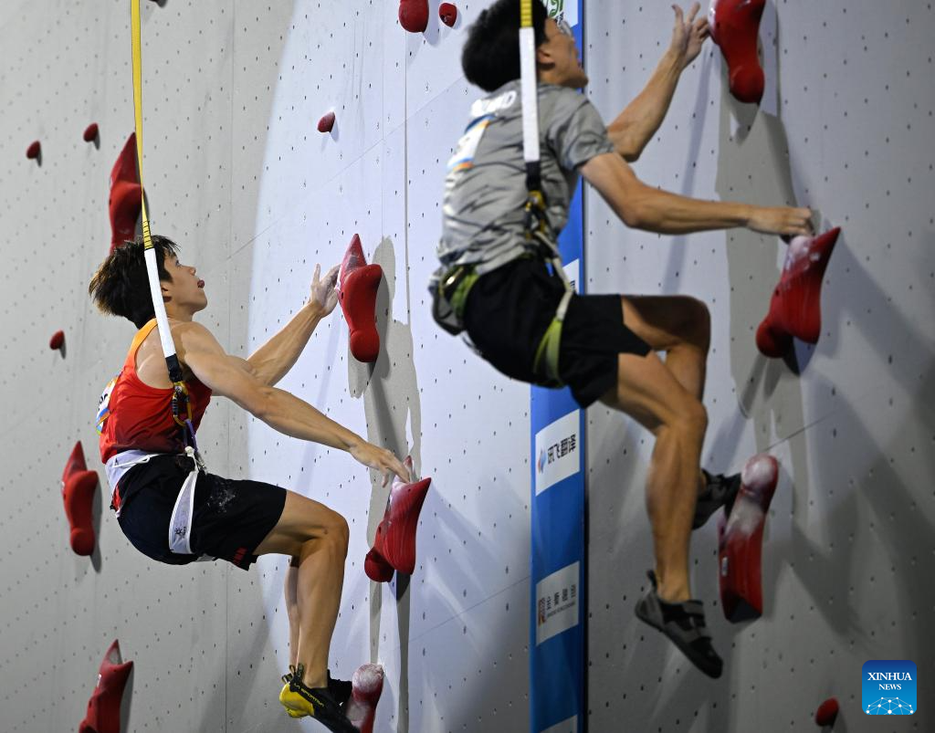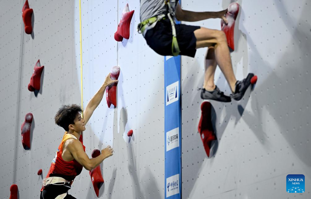 Wu Peng (L) of China competes during the sport climbing (speed) men's individual round of 16 match at the 6th Asian Beach Games in Sanya, south China's Hainan Province, April 28, 2026. (Xinhua/Zhao Zishuo)