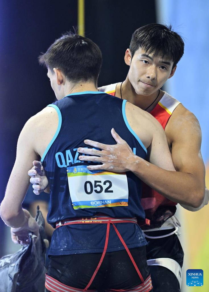 Long Jianguo (R) of China hugs Rishat Khaibullin of Kazakhstan during the sport climbing (speed) men's individual quarterfinal match at the 6th Asian Beach Games in Sanya, south China's Hainan Province, April 28, 2026. (Xinhua/Zhao Zishuo)
