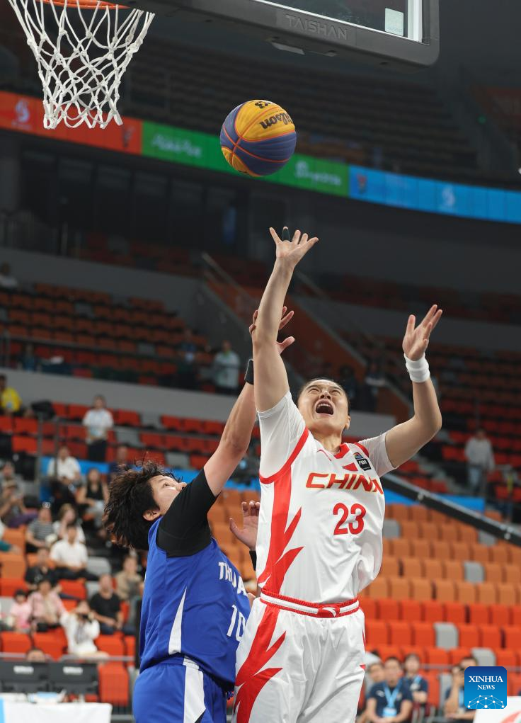 Wang Lili (R) of China shoots during the 3x3 basketball women's semifinal between China and Thailand at the 6th Asian Beach Games in Sanya, south China's Hainan Province, April 29, 2026. (Photo by Ma Zihan/Xinhua)