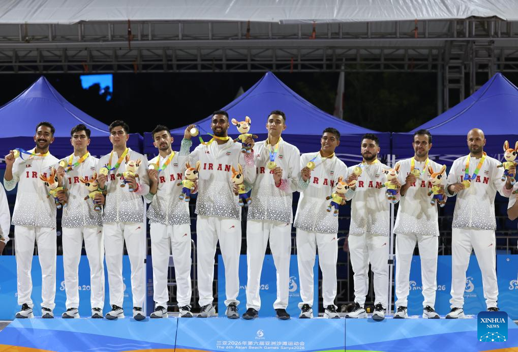 Gold medalists team Iran pose during the awarding ceremony for the men's beach handball at the 6th Asian Beach Games in Sanya, south China's Hainan Province, April 29, 2026. (Xinhua/Li Bo)