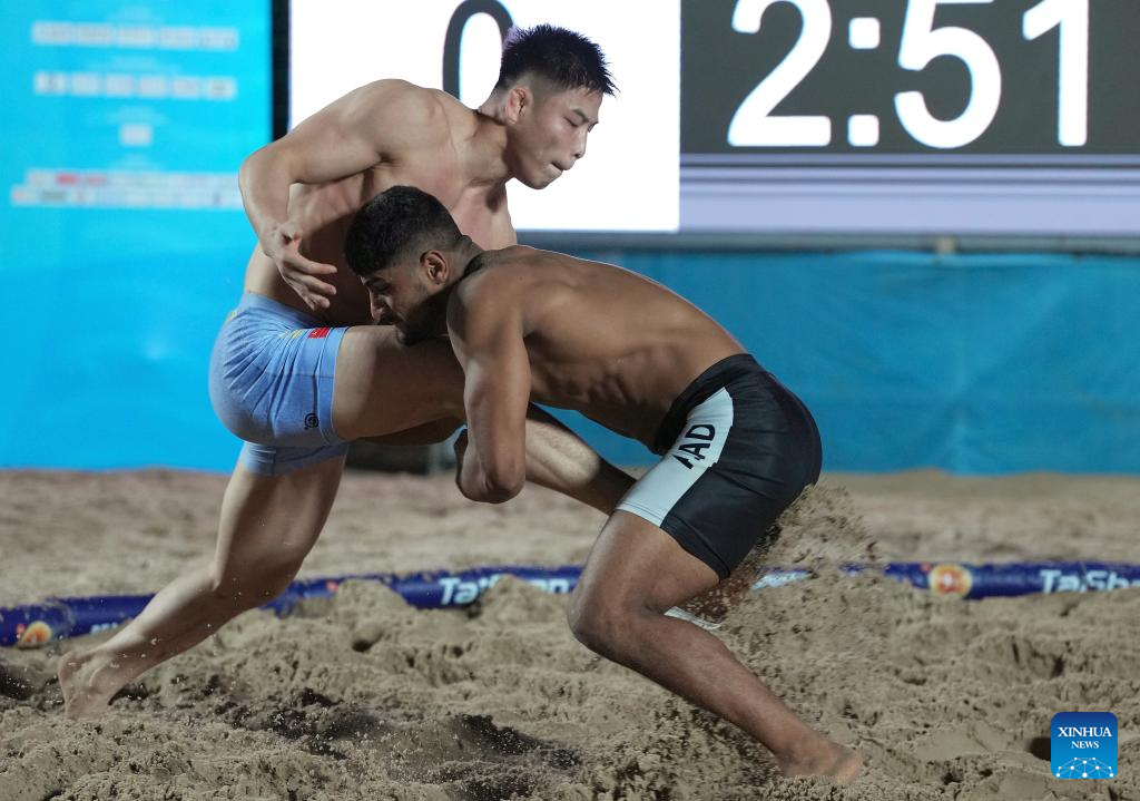 Lu Da (top) of China competes with Muzafar Alimovich Zhappuev of Kyrgyzstan during their beach wrestling men's +90kg semifinal at the 6th Asian Beach Games in Sanya, south China's Hainan Province, April 28, 2026. (Xinhua/Hu Jingwen)