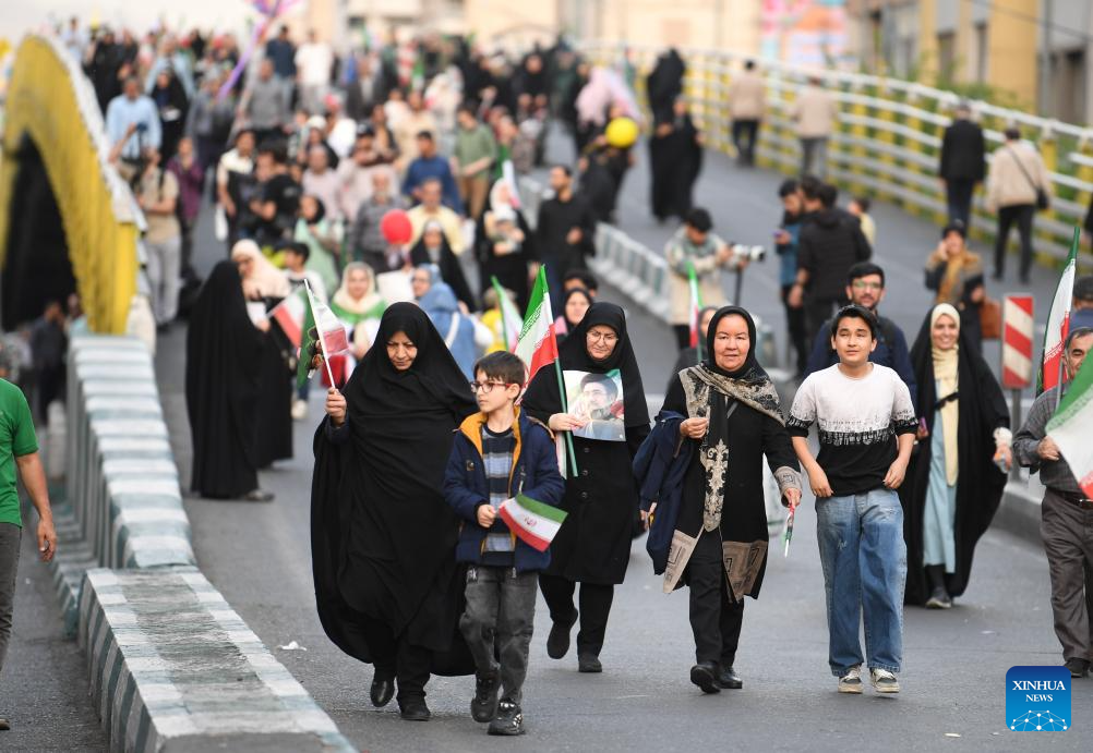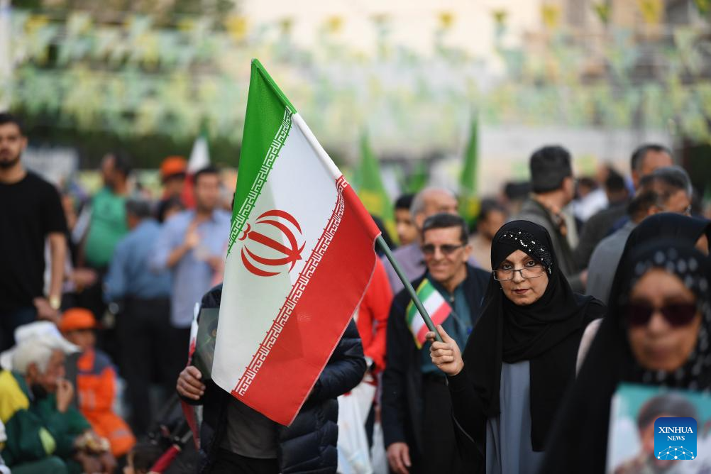 TEHRAN, April 29 (Xinhua) -- Tens of thousands of Iranians took to the streets on Wednesday in mass rallies across the country to pledge allegiance to Supreme Leader Mojtaba Khamenei and demonstrate national unity.