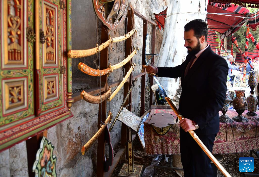 A man examines traditional handcrafted swords at an exhibition in Damascus, Syria, April 29, 2026. The 10-day exhibition features a wide range of traditional products reflecting Syria's cultural identity. (Photo by Ammar Safarjalani/Xinhua)