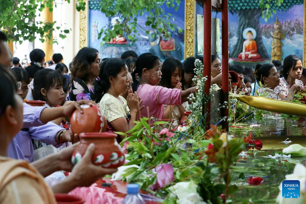 It has been a tradition for Buddhists across Myanmar to attend water pouring ceremonies to cool and bring peace to the Bodhi tree, which is considered the birth partner of Lord Buddha and treated with great reverence. (Xinhua/Myo Kyaw Soe)