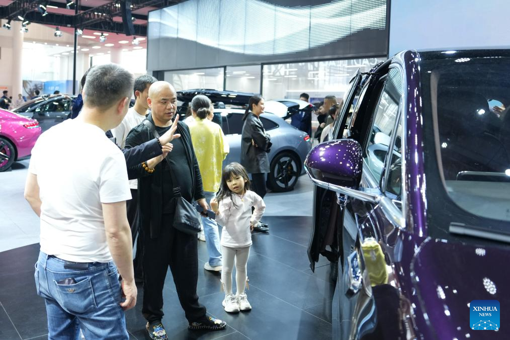 Visitors learn about a motor vehicle displayed at the 2026 Hunan Auto Show in Changsha, central China's Hunan Province, April 30, 2026. The 2026 Hunan Auto Show, with an exhibition area of more than 60,000 square meters, kicked off on Thursday at Hunan International Convention and Exhibition Center in Changsha. The auto show will run until May 5. (Xinhua/Chen Zhenhai)