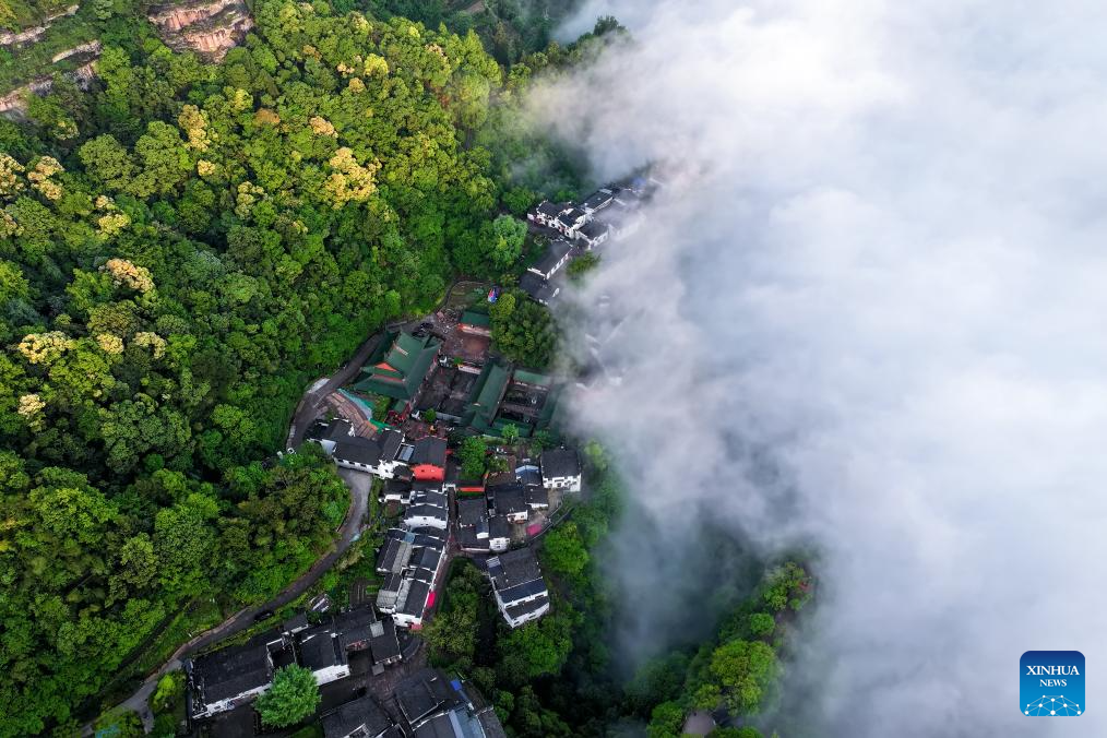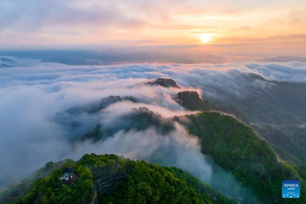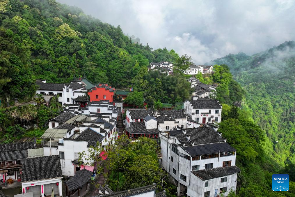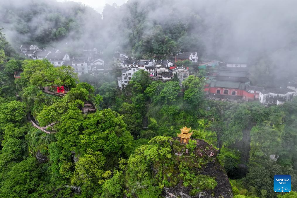 An aerial drone photo taken on April 30, 2026 shows a view of the Qiyun Mountain scenic area after rain in Xiuning County of Huangshan City, east China's Anhui Province. (Photo by Fan Chengzhu/Xinhua)