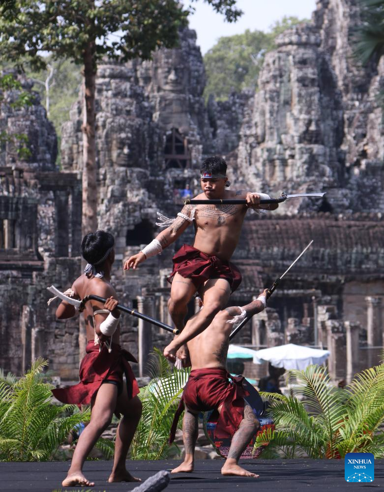Held at the northern area of iconic Bayon Temple, the free-admission event featured a remarkable joint performance showcasing Cambodia's traditional martial arts -- Bokator, Yuthakun Khom, and Kun Khmer boxing -- alongside Chinese martial arts, including Shaolin Kung Fu and Tai Chi. (Photo by Sao Khuth/Xinhua)