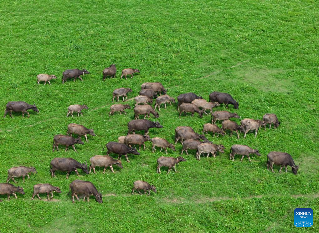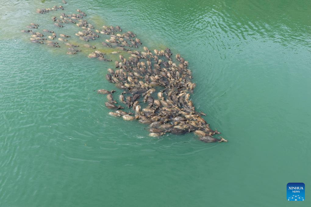 This aerial drone photo shows buffaloes crossing the Jialing River in search of food at a scenic spot in Peng'an County, southwest China's Sichuan Province, April 30, 2026. (Xinhua/Jiang Hongjing)
