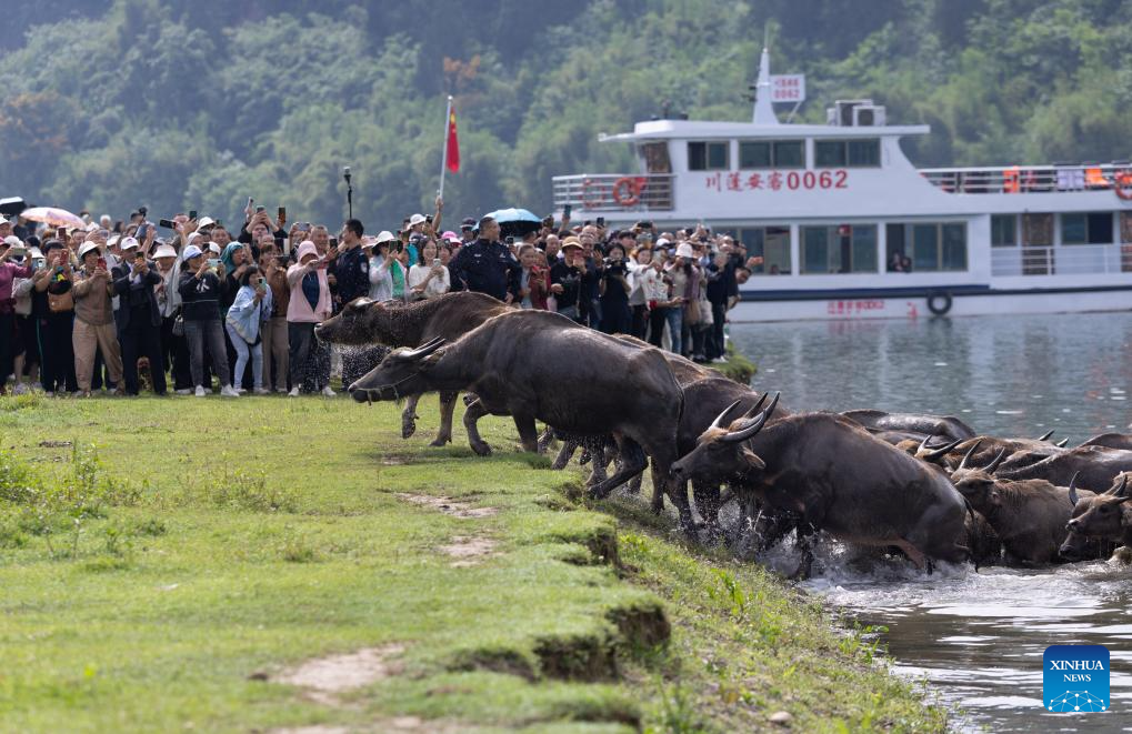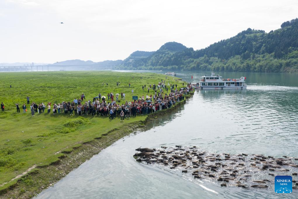 Tourists watch buffaloes arriving at an islet in search of food after crossing the Jialing River at a scenic spot in Peng'an County, southwest China's Sichuan Province, April 30, 2026. (Xinhua/Jiang Hongjing)