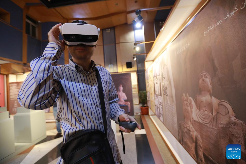A visitor tries an AR device during a digital restoration international tour exhibition of Taiyuan Tianlongshan Grottoes in Cairo, Egypt, Sept. 23, 2023.