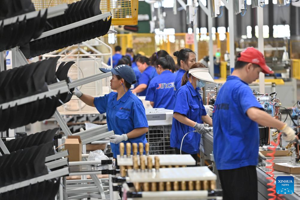 Employees work on a production line of an electrical equipment company in Liuzhou City, south China's Guangxi Zhuang Autonomous Region, Sept. 21, 2023. In recent years, Liuzhou has been promoting the cultivation and expansion of emerging industries such as new-energy, intelligent equipment and smart home appliances manufacturing, biomedicine and new-generation information technology. (Xinhua/Huang Xiaobang)