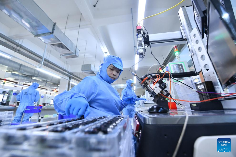 Employees work on a production line of Liuzhou Yuanchuang EFI Thecnology Co., Ltd. in Liuzhou City, south China's Guangxi Zhuang Autonomous Region, Sept. 21, 2023. In recent years, Liuzhou has been promoting the cultivation and expansion of emerging industries such as new-energy, intelligent equipment and smart home appliances manufacturing, biomedicine and new-generation information technology. (Xinhua/Huang Xiaobang)