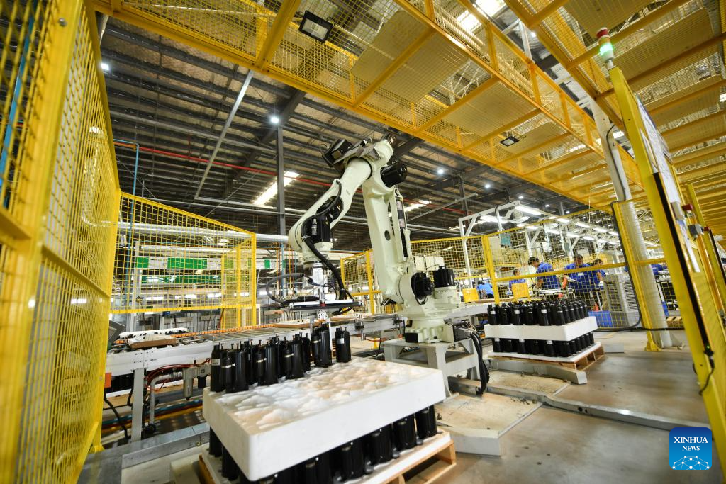 A robot works on a production line of an electrical equipment company in Liuzhou City, south China's Guangxi Zhuang Autonomous Region, Sept. 21, 2023. In recent years, Liuzhou has been promoting the cultivation and expansion of emerging industries such as new-energy, intelligent equipment and smart home appliances manufacturing, biomedicine and new-generation information technology. (Xinhua/Huang Xiaobang)
