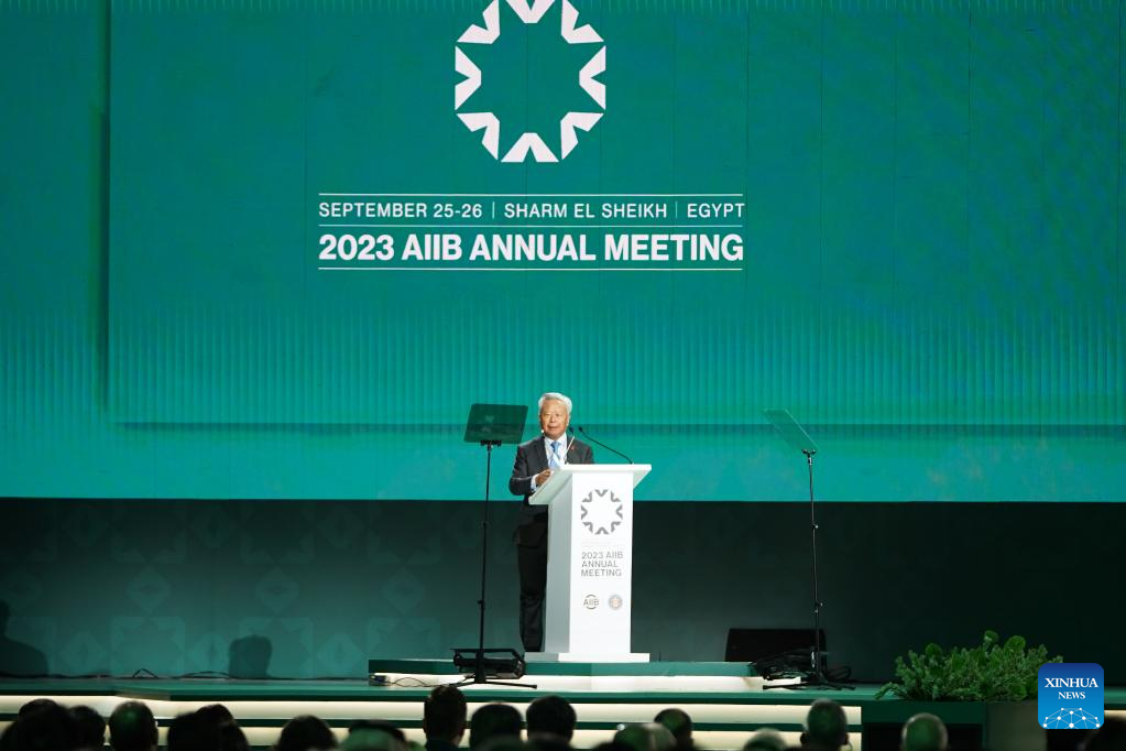 The Asian Infrastructure Investment Bank (AIIB) President and Chair of the Board Jin Liqun addresses the opening of the eighth annual meeting of the AIIB in Sharm El-Sheikh, Egypt, on Sept. 25, 2023. (AIIB/Handout via Xinhua)