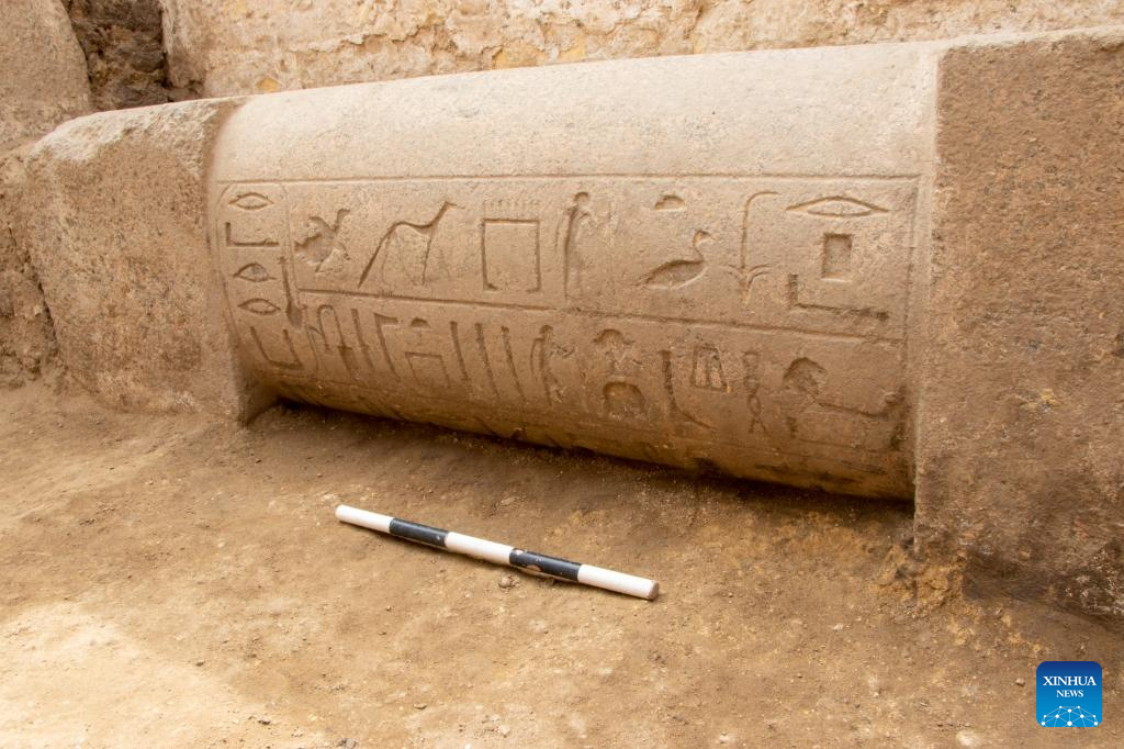 This undated photo shows a stone carved with hieroglyphic inscriptions unearthed within a tomb of an Egyptian prince in Saqqara necropolis, south of Cairo, Egypt.