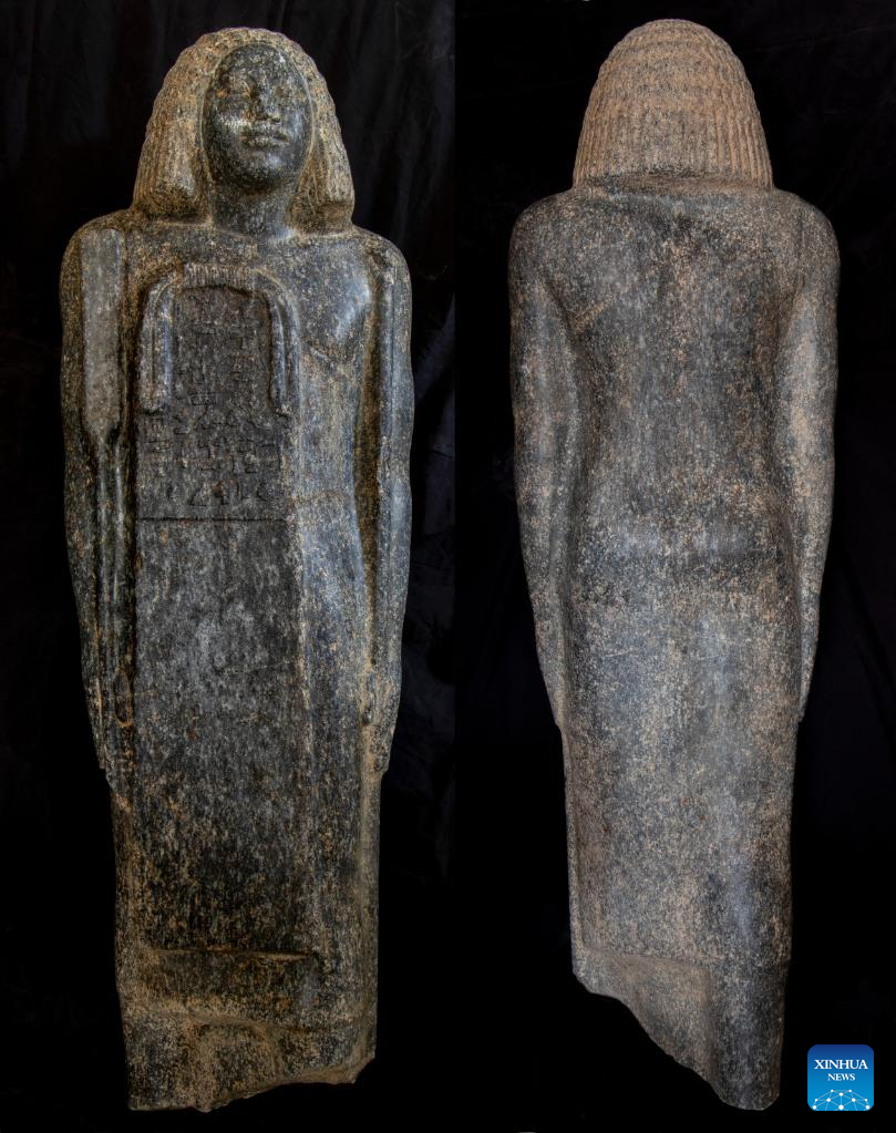 This image shows two sides of a statue unearthed at a tomb of an Egyptian prince in Saqqara necropolis, south of Cairo, Egypt.
