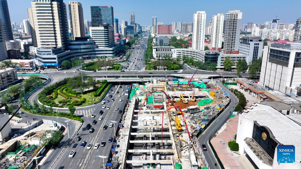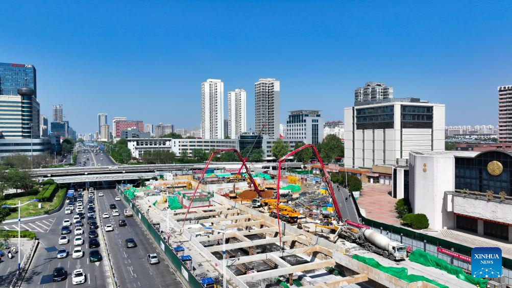 An aerial drone photo taken on April 19, 2025 shows the capping of the main structure of Bayi Overpass Station of Jinan Metro Line 4 (Phase I) in Jinan, east China's Shandong Province. With the successful capping of the main structure of Bayi Overpass Station, the construction of the main structure of Jinan Metro Line 4 (Phase I) has been completed. (Xinhua/Guo Xulei)