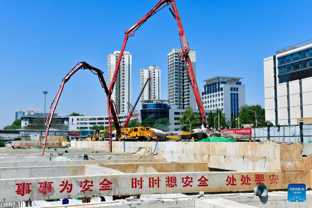 This photo taken on April 19, 2025 shows the capping of the main structure of Bayi Overpass Station of Jinan Metro Line 4 (Phase I) in Jinan, east China's Shandong Province. With the successful capping of the main structure of Bayi Overpass Station, the construction of the main structure of Jinan Metro Line 4 (Phase I) has been completed. (Xinhua/Guo Xulei)