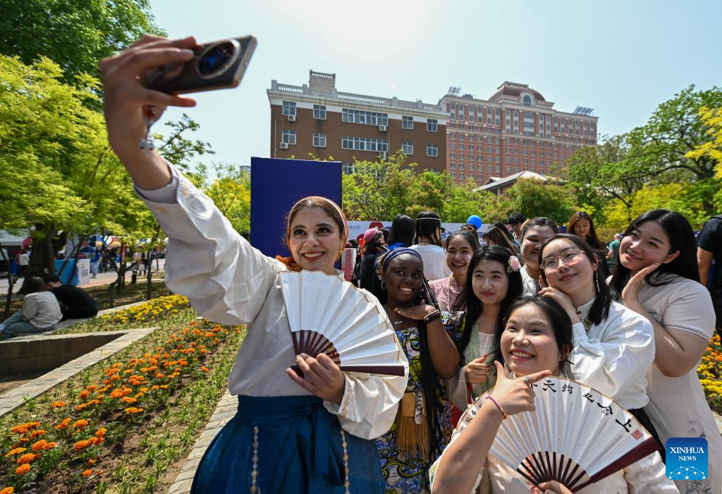 Students takes selfies during the 8th International Culture Festival of Tianjin Foreign Studies University in north China's Tianjin, April 20, 2025. More than 300 students and teachers from over 60 countries and regions participated in the festival. (Xinhua/Sun Fanyue)