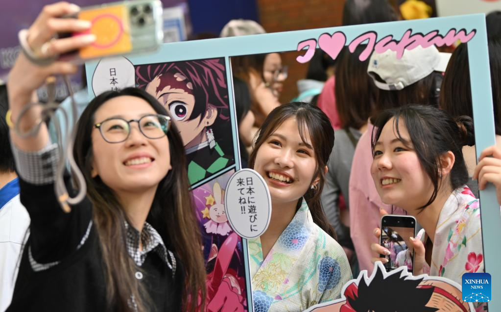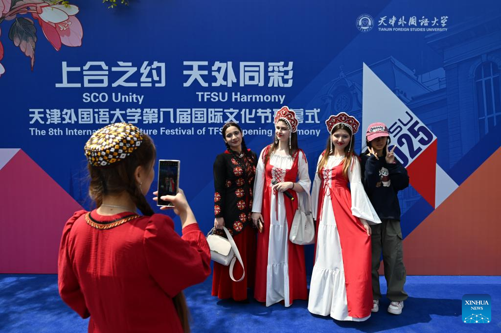 Students pose for photos during the 8th International Culture Festival of Tianjin Foreign Studies University in north China's Tianjin, April 20, 2025. More than 300 students and teachers from over 60 countries and regions participated in the festival. (Xinhua/Sun Fanyue)