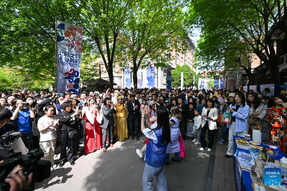 Students dance during the 8th International Culture Festival of Tianjin Foreign Studies University in north China's Tianjin, April 20, 2025. More than 300 students and teachers from over 60 countries and regions participated in the festival. (Xinhua/Sun Fanyue)