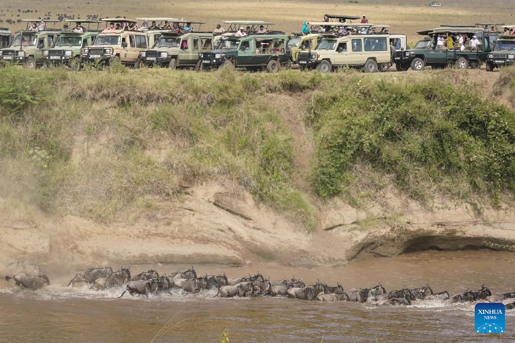 Tourists gather near the Mara River to watch wildebeests crossing in the Masai Mara National Reserve in Kenya, July 30, 2025. Tourists flock to the Masai Mara National Reserve during the country's peak tourism season from June to October to watch the wildebeest migration. (Xinhua/Han Xu)