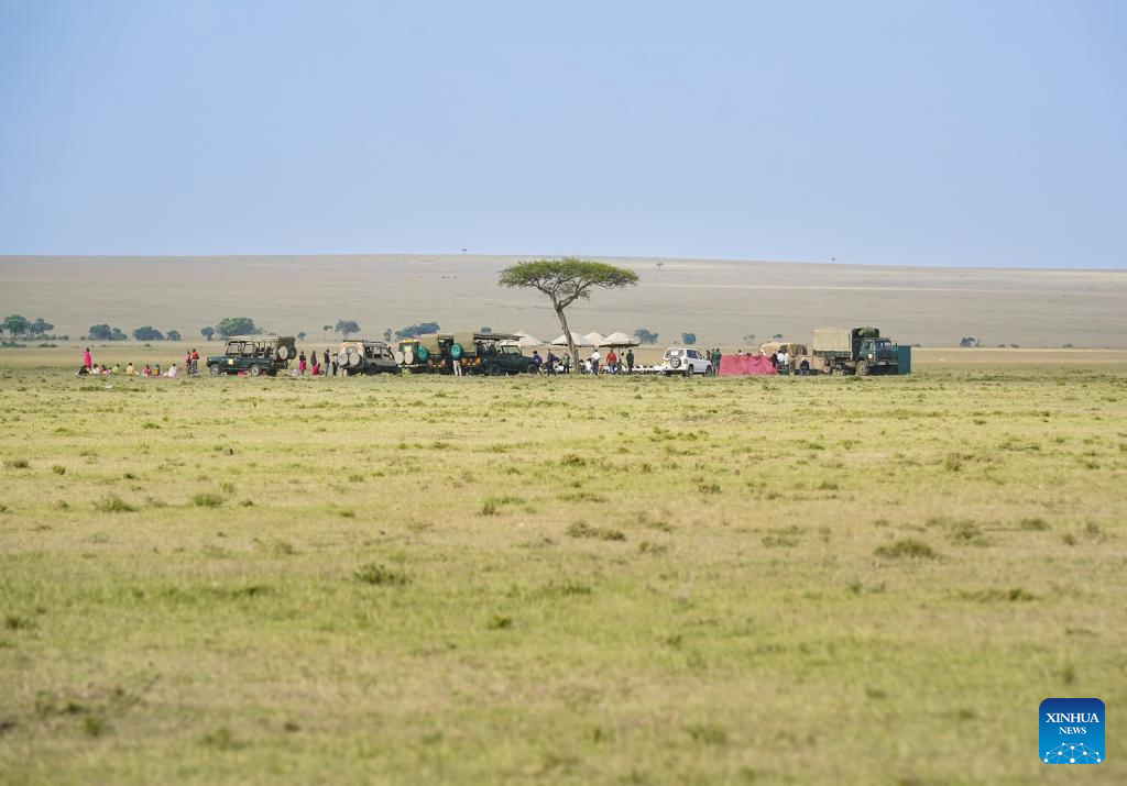Tourists have a picnic in the Masai Mara National Reserve in Kenya, Aug. 1, 2025. Tourists flock to the Masai Mara National Reserve during the country's peak tourism season from June to October to watch the wildebeest migration. (Xinhua/Han Xu)