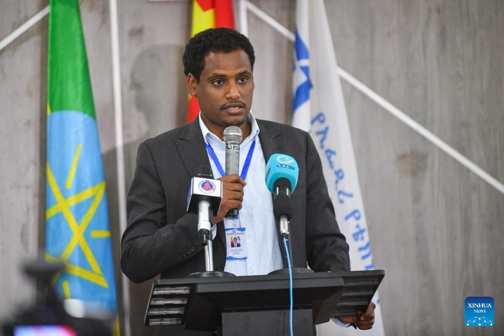 Biruk Kedir, director general of the Ethiopian Technical and Vocational Training Institute, speaks at an award ceremony of the Second Ethiopia Online Chinese Video Competition, in Addis Ababa, Ethiopia, on Dec. 11, 2025. The Chinese Embassy in Ethiopia on Thursday announced winners of the Second Ethiopia Online Chinese Video Competition at a ceremony held at the Ethiopian Technical and Vocational Training Institute in Addis Ababa. (Photo by Michael Tewelde/Xinhua)