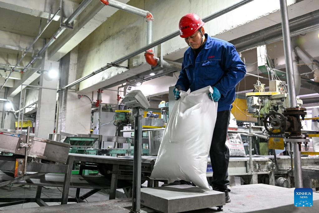 An employee works at a fertilizer company in Manas County of Changji Hui Autonomous Prefecture, northwest China's Xinjiang Uygur Autonomous Region, on March 4, 2026. Agricultural supply manufacturers in Xinjiang are working at full capacity to fulfill orders and ensure a steady flow of fertilizers and materials for spring farming.