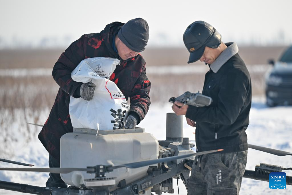 People load a drone with fertilizers in Letuyi Town of Manas County of Changji Hui Autonomous Prefecture, northwest China's Xinjiang Uygur Autonomous Region, on March 4, 2026. Agricultural supply manufacturers in Xinjiang are working at full capacity to fulfill orders and ensure a steady flow of fertilizers and materials for spring farming.