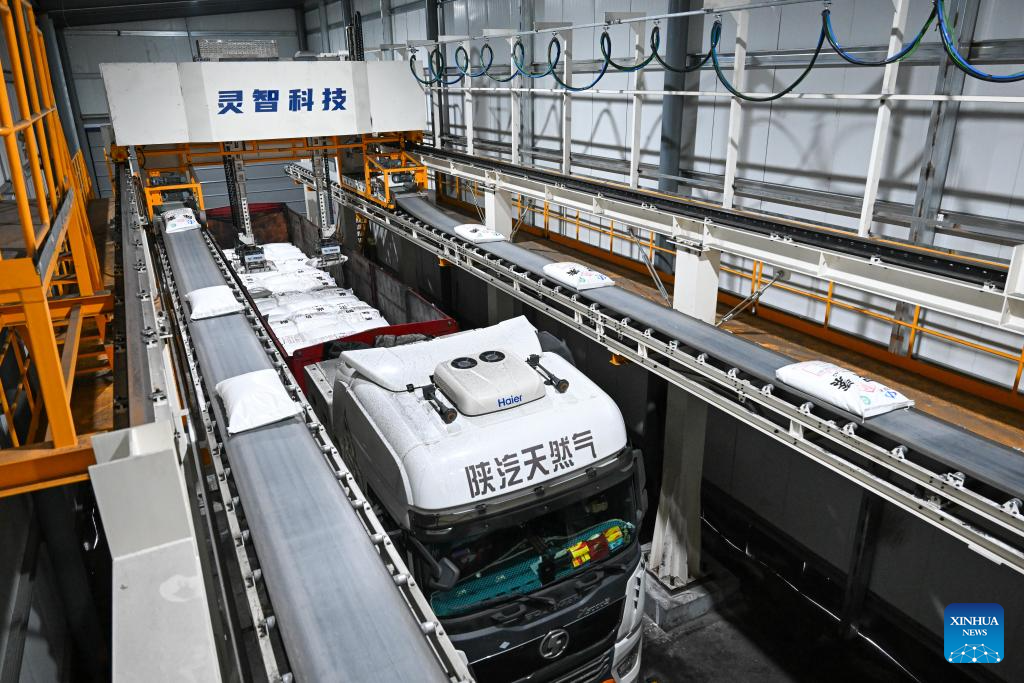 This photo taken on March 5, 2026 shows an automatic loading machine at a fertilizer company in Manas County of Changji Hui Autonomous Prefecture, northwest China's Xinjiang Uygur Autonomous Region. Agricultural supply manufacturers in Xinjiang are working at full capacity to fulfill orders and ensure a steady flow of fertilizers and materials for spring farming.