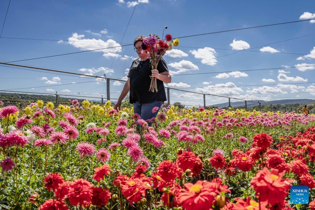 A visitor holds a bunch of flowers at the Dahlia Festival in Magaliesburg, South Africa, March 29, 2026.