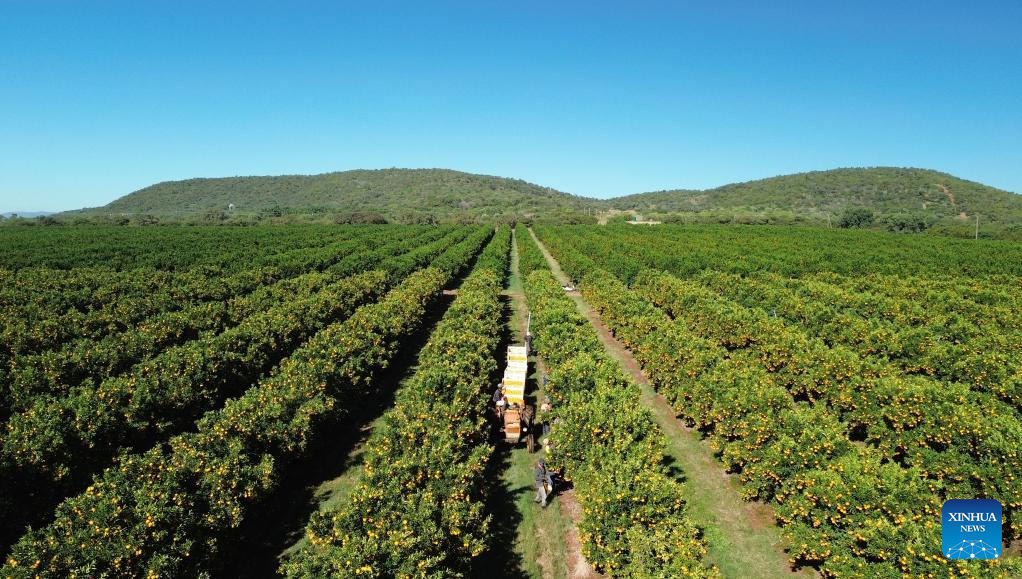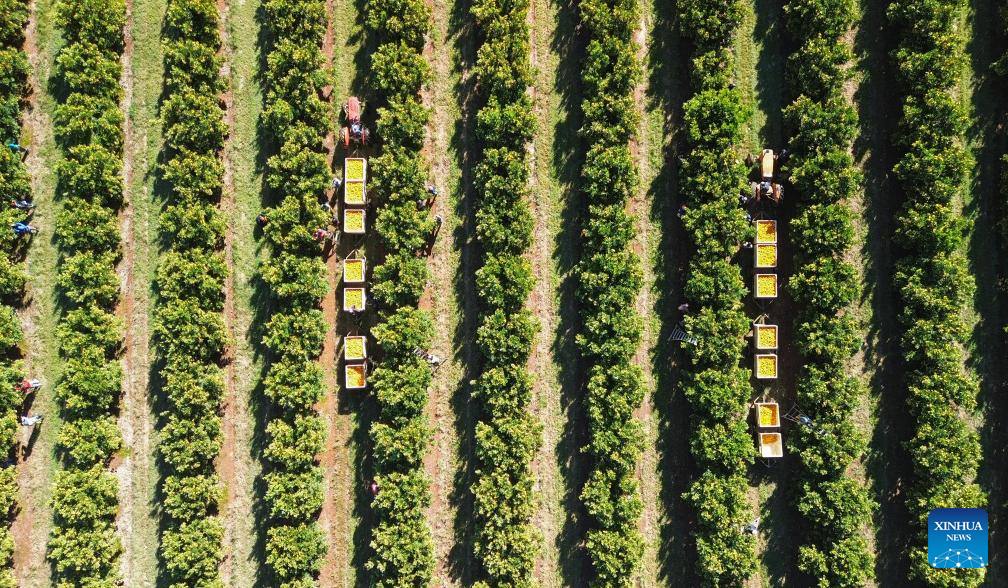 A drone photo taken on April 28, 2026 shows a citrus farm in Brits, North West Province, South Africa. The harvest season of citrus in South Africa, a leading exporter of fresh citrus in the world, lasts from February to September. (Xinhua/Chen Wei)