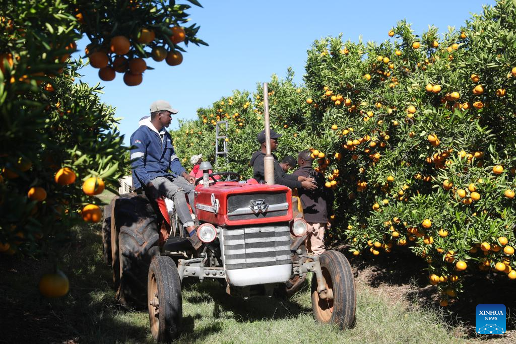 Workers harvest citrus at a farm in Brits, North West Province, South Africa, April 28, 2026. The harvest season of citrus in South Africa, a leading exporter of fresh citrus in the world, lasts from February to September. (Xinhua/Chen Wei)