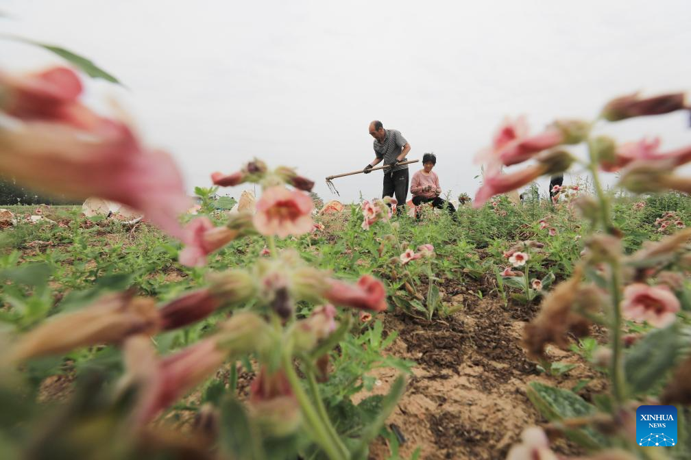 Farmers work in a field in Houbeima Village of Fantian Town, Jiaozuo City of central China's Henan Province, April 28, 2026. (Photo by Huang Fuxing/Xinhua)