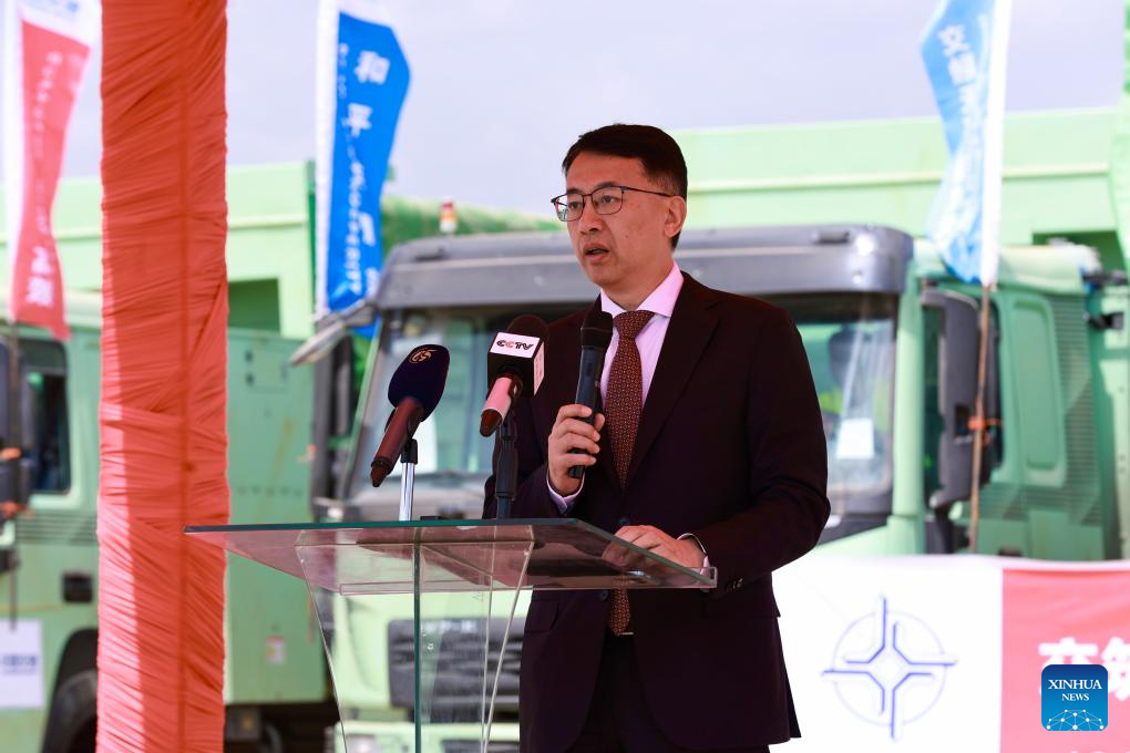 Liu Xiaoguang, minister counselor of the Chinese Embassy in Ethiopia, speaks during the inauguration event at the construction site of the Bishoftu International Airport, near Bishoftu town in the Oromia regional state of Ethiopia, April 29, 2026. China Communications Construction Company (CCCC) on Wednesday introduced 50 electric heavy-duty trucks to Ethiopia's mega airport project site, promoting green mobility and development in the country's logistics and construction sectors. (Xinhua/Geng Xinning)