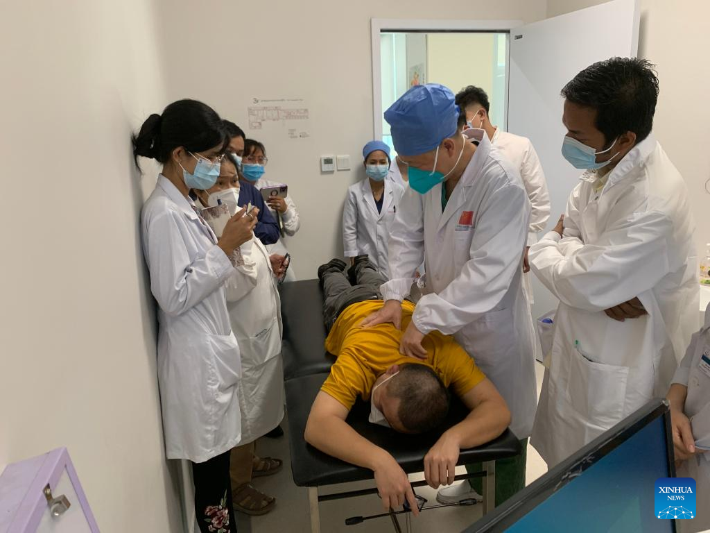A traditional Chinese medicine expert shows massage techniques to Cambodian medical personnel in Phnom Penh, Cambodia, March 23, 2023. A three-week seminar on acupuncture and Tuina remedial massage conducted by traditional Chinese medicine (TCM) experts for Cambodian medical talents concluded on Friday. (Photo by Van Pov/Xinhua)