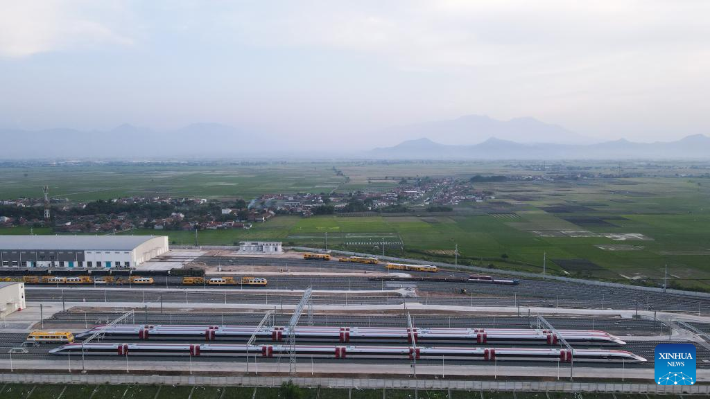 This aerial photo taken on July 20, 2023 shows high-speed railway trains parking near the joint workshop for Jakarta-Bandung High-Speed Railway in Bandung, West Java Province, Indonesia.(Xinhua/Xu Qin)