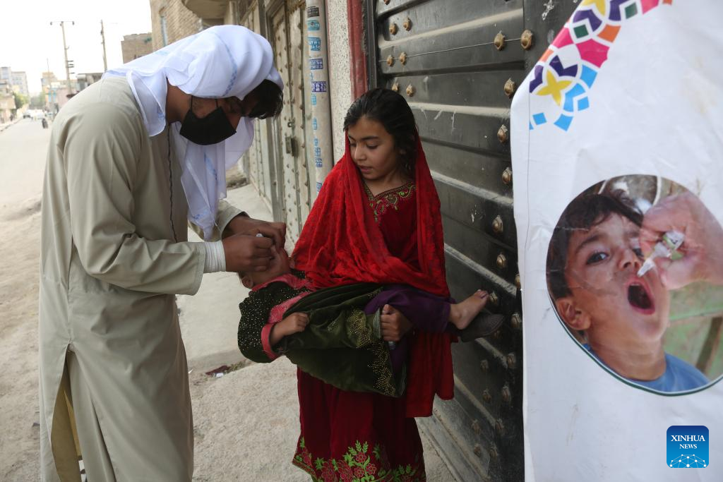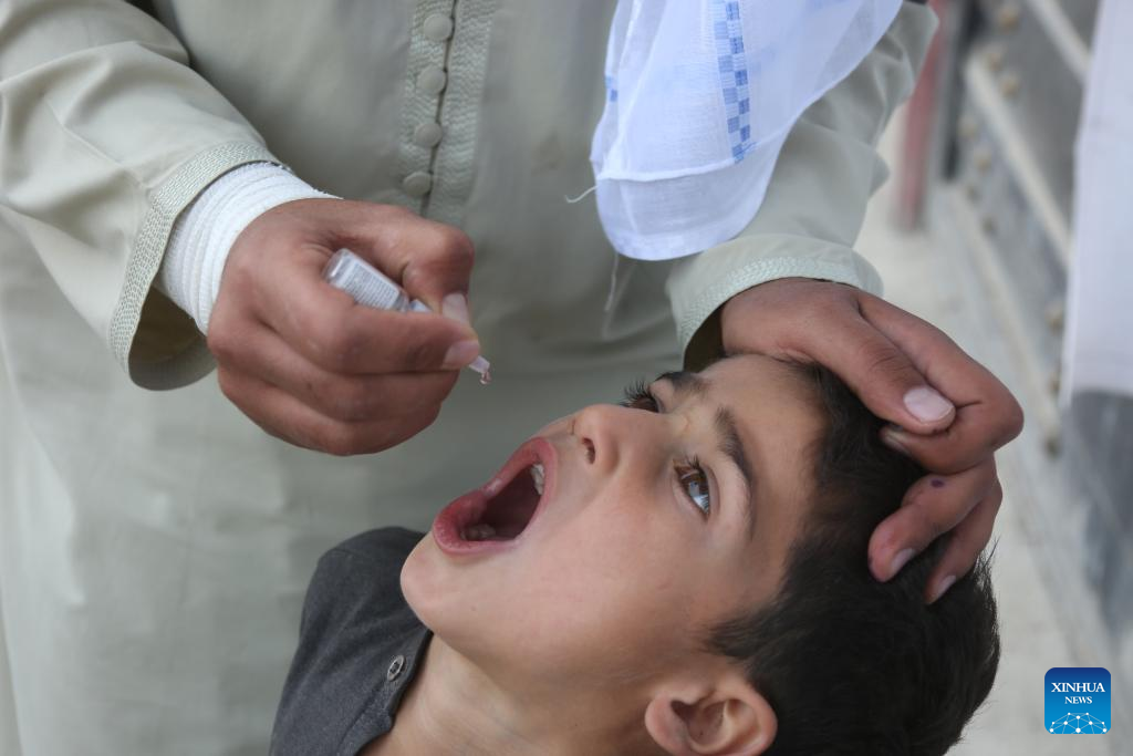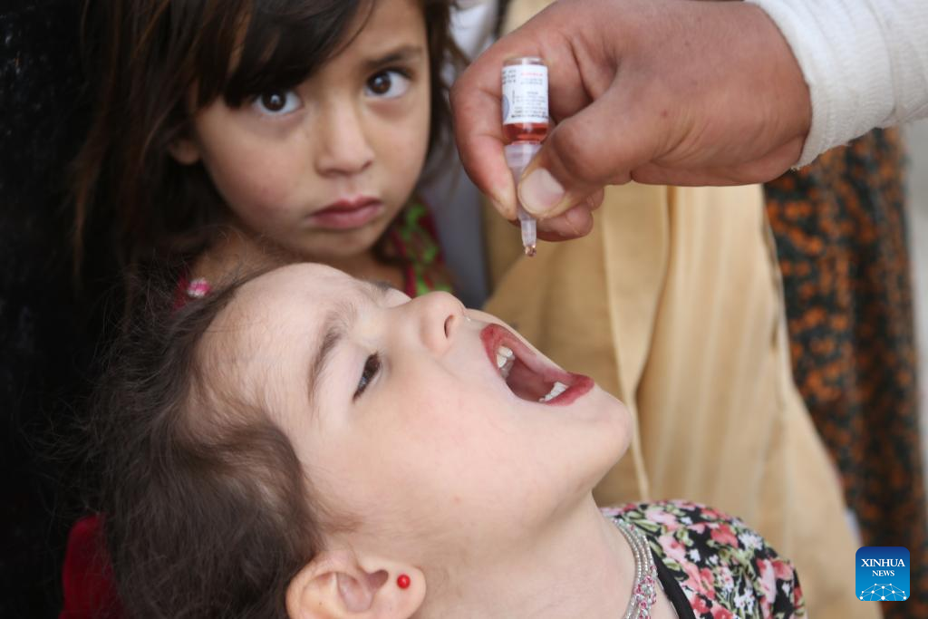 A health worker gives a dose of polio vaccine to a child during a polio vaccination campaign in Kabul, Afghanistan, on April 21, 2025. The Afghan interim government's Ministry of Public Health launched a nationwide campaign on Monday to give polio vaccination doses to 11.6 million children under five, the ministry said in a statement. (Photo by Saifurahman Safi/Xinhua)