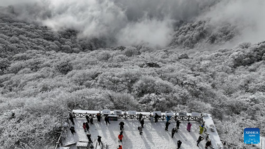 An aerial drone photo taken on Jan. 26, 2025 shows tourists enjoying the scenery on Mount Fanjing in Tongren City, southwest China's Guizhou Province. Mount Fanjing is a World Heritage Site that covers an area of 775 square kilometers. It not only provides an important glimpse into geological evolution in southern China but also serves as an ecological security barrier in the middle and upper reaches of the Yangtze River. (Photo by Li He/Xinhua)