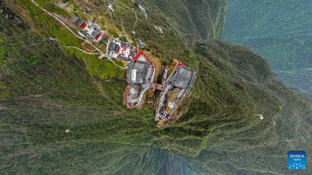 An aerial drone photo taken on April 15, 2025 shows tourists enjoying the scenery on Mount Fanjing in Tongren City, southwest China's Guizhou Province. Mount Fanjing is a World Heritage Site that covers an area of 775 square kilometers. It not only provides an important glimpse into geological evolution in southern China but also serves as an ecological security barrier in the middle and upper reaches of the Yangtze River. (Xinhua/Yang Wenbin)