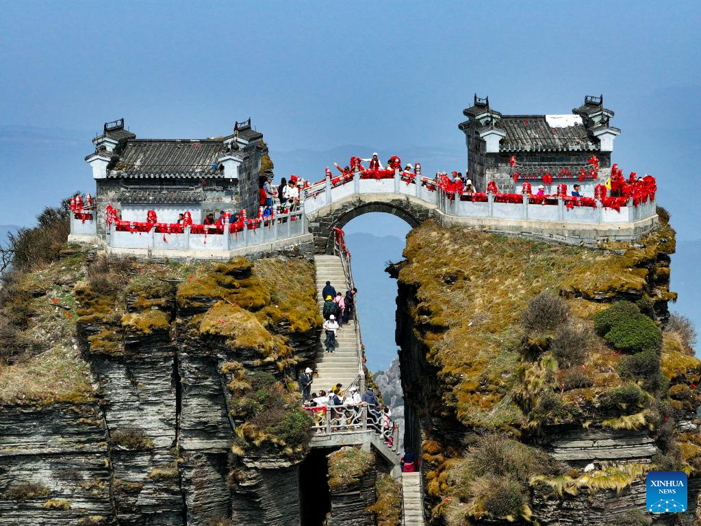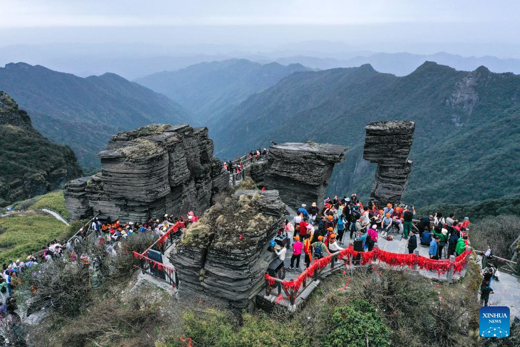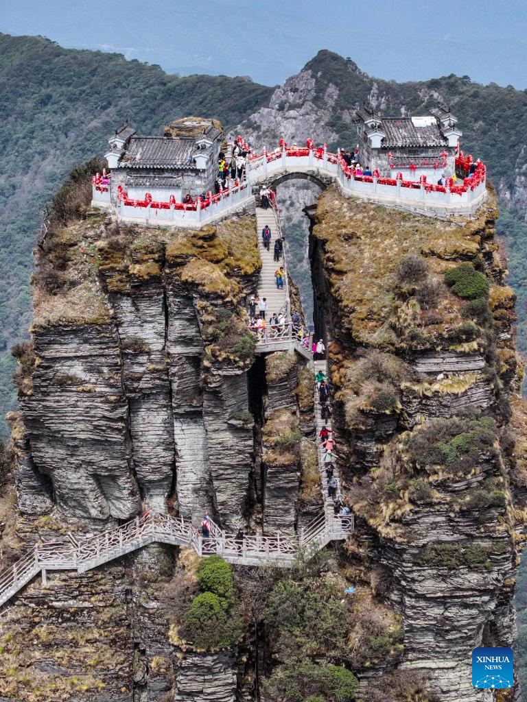 Tourists visit the Mount Fanjing in Tongren City, southwest China's Guizhou Province on April 15, 2025. Mount Fanjing is a World Heritage Site that covers an area of 775 square kilometers. It not only provides an important glimpse into geological evolution in southern China but also serves as an ecological security barrier in the middle and upper reaches of the Yangtze River. (Xinhua/Yang Wenbin)