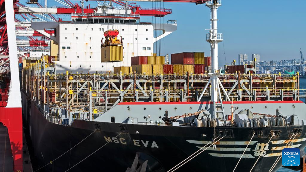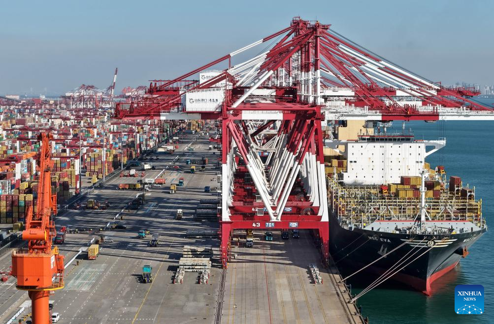 This photo taken on Dec. 8, 2025 shows a cargo ship at a container terminal of Qingdao Port in Qingdao, east China's Shandong Province. The cargo throughput of Qingdao Port in 2025 surpassed 700 million tonnes on Monday, reaching this milestone 15 days earlier compared to 2024.