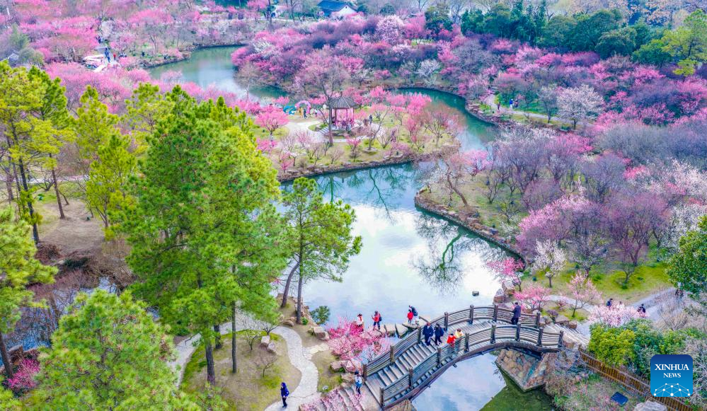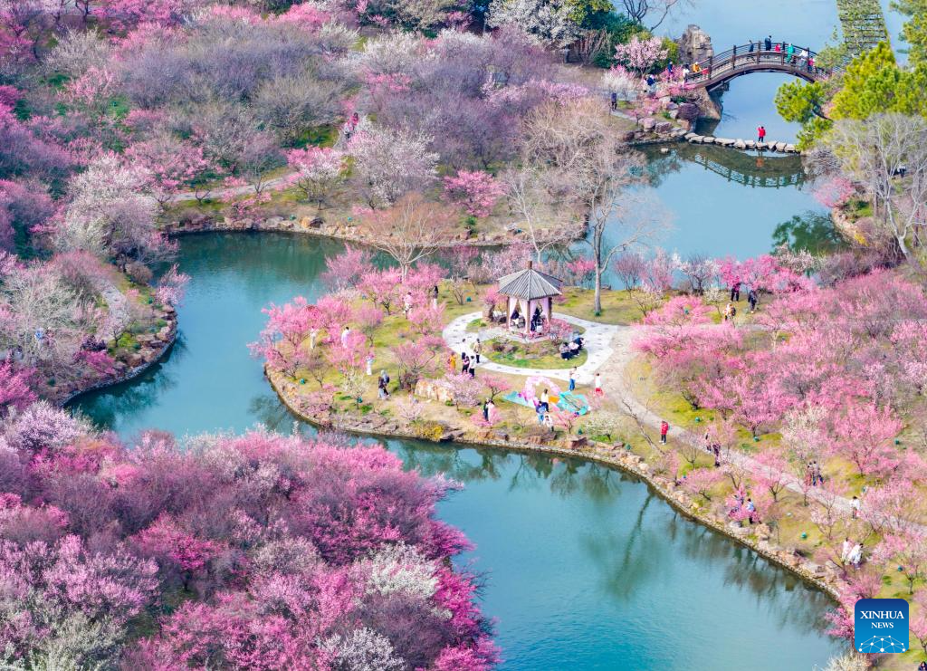 An aerial drone photo taken on Feb. 25, 2026 shows tourists visiting the Meihua Mountain at the imperial Xiaoling Mausoleum scenic area of Nanjing, east China's Jiangsu Province. (Photo by Yang Suping/Xinhua)
