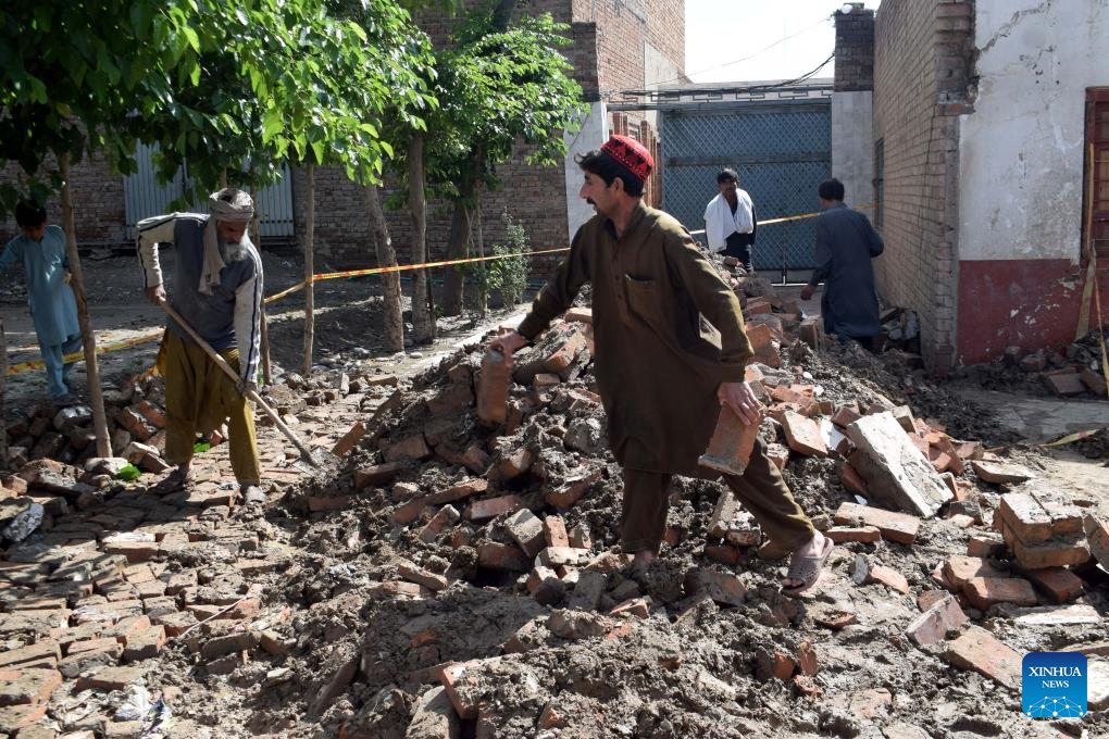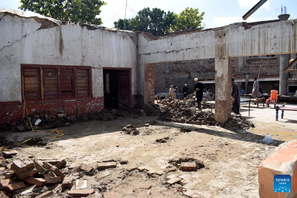 People work at a damaged house after heavy rain in Bannu, Pakistan, March 30, 2026. (Str/Xinhua)
