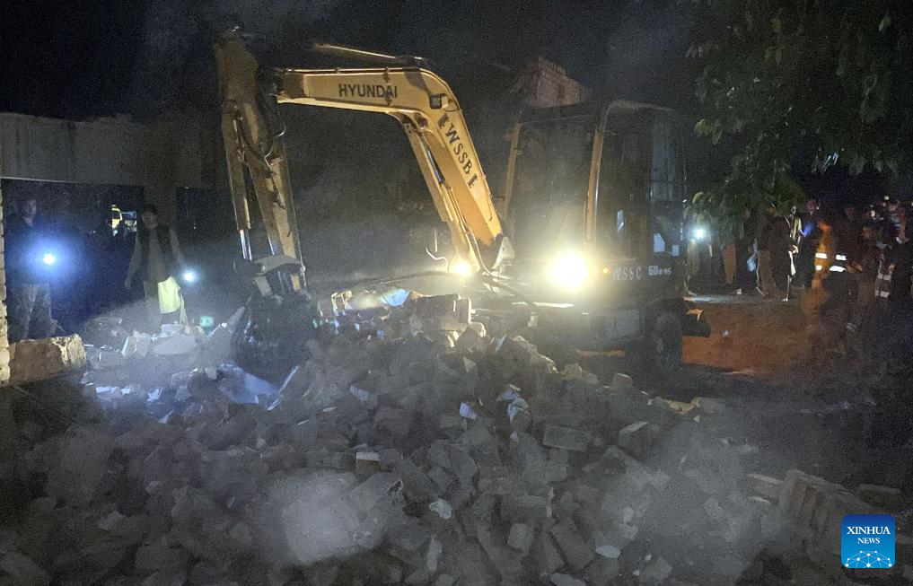 A staff member operates an excavator to remove debris of a damaged house after heavy rain in Bannu, Pakistan, March 30, 2026. (Str/Xinhua)